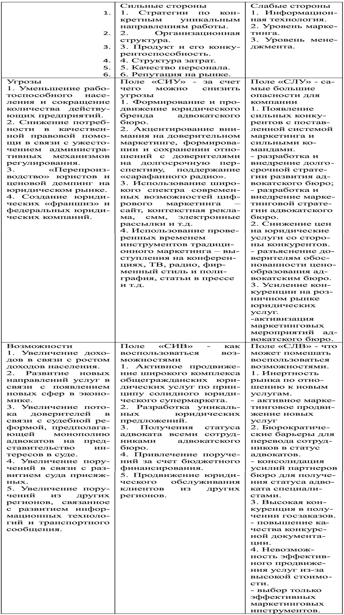 Цель – выявить стратегические маркетинговые альтернативы, сформулировать основные направления развития адвокатского бюро через систематизацию имеющейся информации о сильных и слабых сторонах компании, а также о потенциальных возможностях и угрозах для ее деятельности. Представим его в таблице № 8.