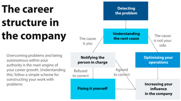 The path to success is largely determined by a person’s involvement and willingness to work independently. For a XXI-century employer, the most important thing is that you as an employee can perform your job duties well and quickly and do not create additional obstacles for the business. However, a wealth of experience shows that this is not enough today. The market is showing changing trends and making new demands on employees. Nowadays, to get a good job at a high-potential company, you must not only show work experience and formal education but also prove your positive non-standard character in practice by coming to the interview, after which you must successfully overcome the adaptation period [19]. It is possible to assess effectiveness only in dynamics and concerning specific functions and metrics, but a little contact and interaction are enough to make a hiring decision. This is only because the manager must understand the likely minimum requirements for him, be willing to work within the rules, and meet the expectations of the employer. Otherwise, the problem of efficiency cannot be solved. Stepping onto the path of improvement, you take on a heavy burden full of frustrations and difficulties, through which you gain invaluable experience. And it is invaluable only because its accumulation is valued by potential and future employers, and will be used by you in other positions.