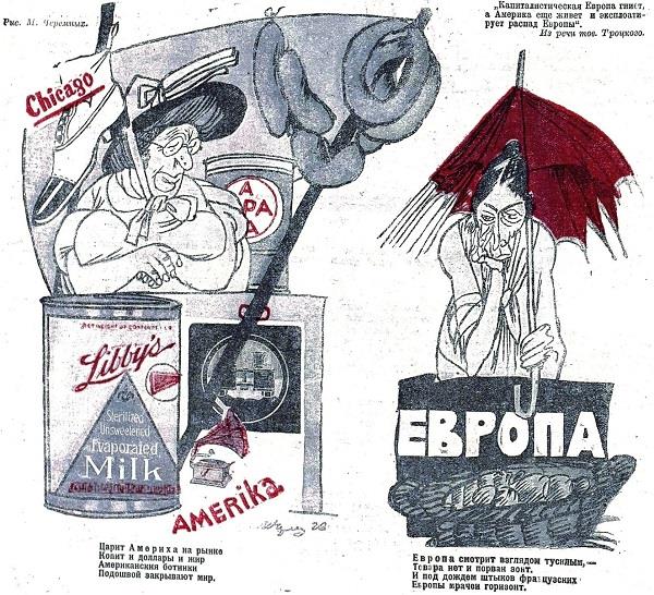Нарисована она в качестве иллюстрации к цитате из выступления товарища Троцкого: «Капиталистическая Европа гниет, а Америка еще живет и эксплуатирует распад Европы».
