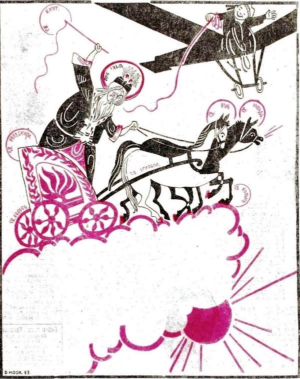 Карикатура Дмитрия Моора носит длинное название: «Кто перегонит? Состязание Ильи-пророка и комсомольца».