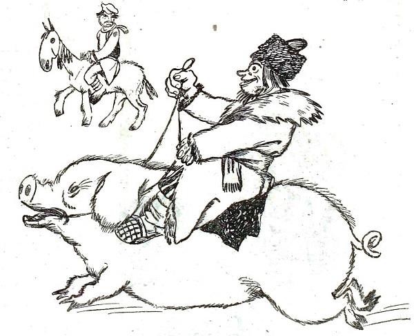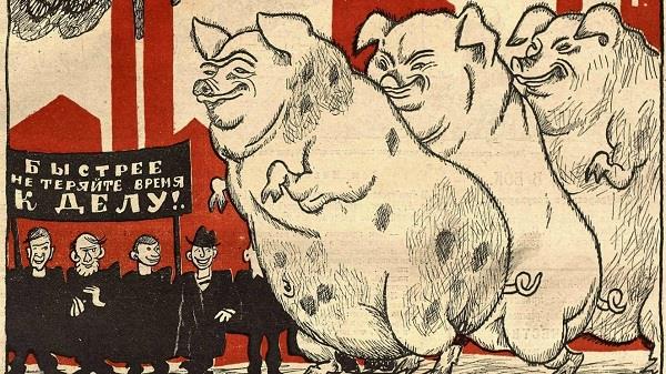 Карикатура Ивана Малютина иллюстрирует абсолютно рекламную цитату: «Свинья спасла немцев; свинья одела и обула семью; в свинье сто пудов хлеба; свинья спасла от нищеты; свинья – самая доходная статья. (газета «Беднота»).