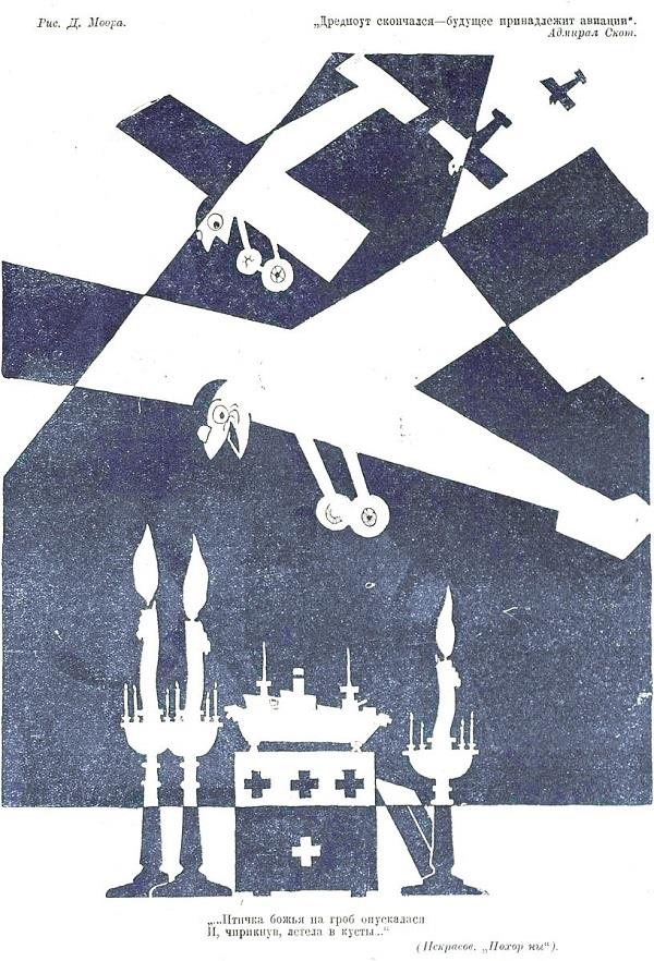 Это иллюстрация высказывания «Дредноут скончался – будущее принадлежит авиации» адмирала Скотта, но какого из многочисленных Скоттов – я так и не нарыл.