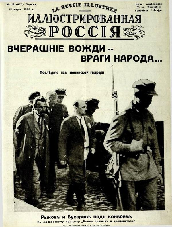 P.S. Обложка белоэмигрантского журнала – фейковая. На самом деле фото Бухарина и Рыкова «с конвойными», попавшее даже в статью Википедии о Третьем Московском процессе, сделано на похоронах П.Л. Войкова в 1927 году.