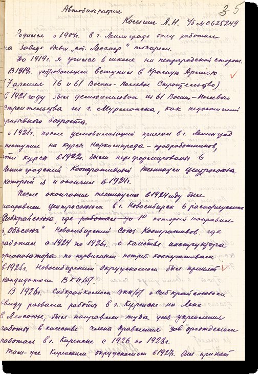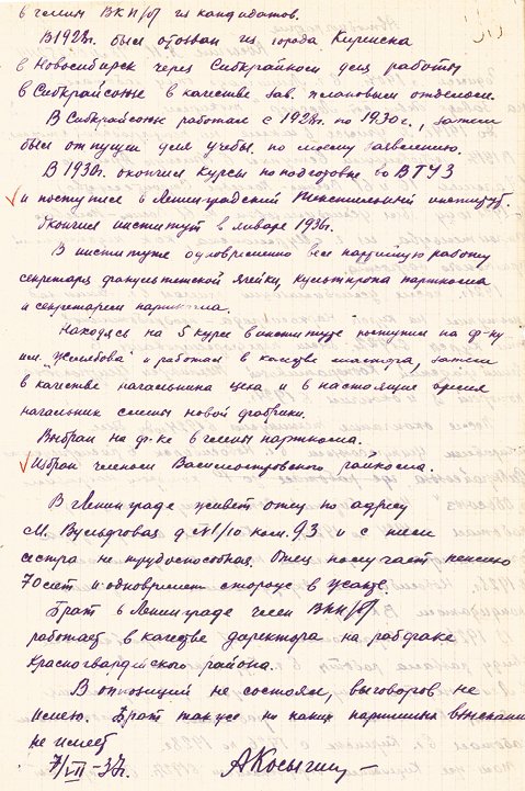 В автобиографии (от 7 июля 1937 года) Косыгин писал, что «был отпущен для учебы “по моему заявлению”» (ЦГАИПД СПб. Ф. Р-1728. Оп. 1. Д. 420046/2. Л. 5).