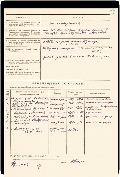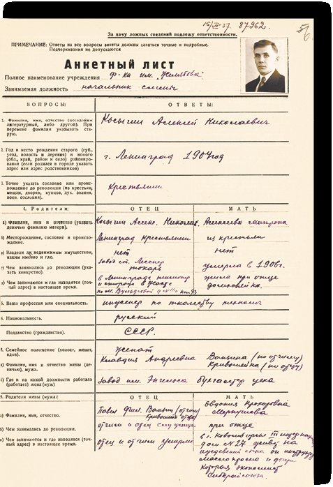 Анкетный лист начальника смены Ленинградской текстильной фабрики имени А. И. Желябова А. Н. Косыгина