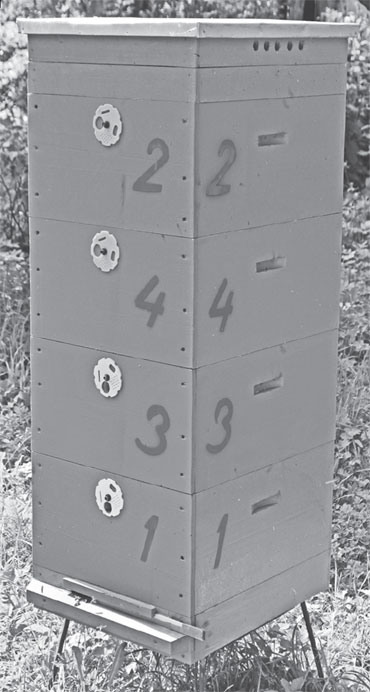 Дадановский улей. Во время устойчивого медосбора верхние и нижние летки должны быть приоткрыты так, чтобы не создавалось затора для пчел и не застужался расплод