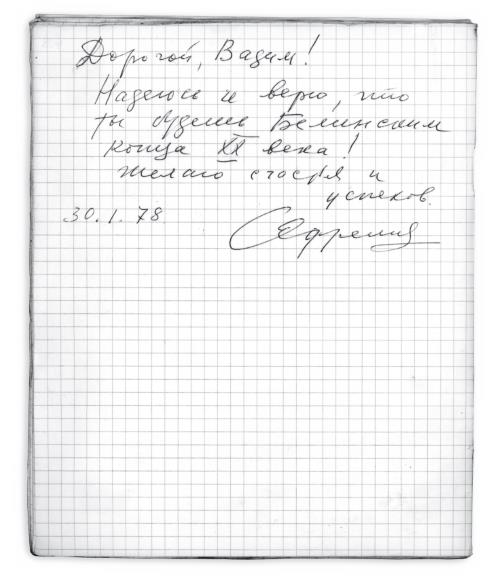 В детстве, когда все играют в футбол и прочие подвижные игры, у меня была одна страсть – театр. Я не ходил ни в какие кружки, не участвовал в конкурсах самодеятельности, а сидел в своей комнате и делал альбомы. Вырезал из газет и журналов статьи об артистах и спектаклях, фотографии, программки. С помощью канцелярского клея, авторучки и фломастеров все это обретало только мне ведомую жизнь. Это были альбомы о Большом театре, Московском Художественном, Вахтанговском, Малом театре, «Современнике», об артистах Татьяне Дорониной, Андрее Миронове, Юлии Борисовой… Тираж каждого такого альбома – один экземпляр. Читателей – двое, папа и мама. Иногда папа, главный режиссер литературно-драматического вещания Всесоюзного радио, с гордостью показывал мои альбомы героям публикаций, которых записывал в своих постановках, и тогда аудитория разрасталась до трех человек. В седьмом классе я сделал альбом про Олега Николаевича Ефремова, и в награду получил его письменный отзыв: «Дорогой Вадим! Надеюсь и верю, что ты будешь Белинским конца XX века!». Вот так, ни больше – ни меньше.