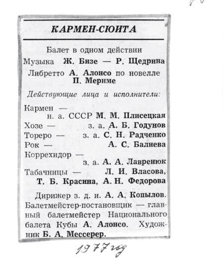 И дата – 4 мая 1976 года. Не менее сильным впечатлением был дождь из красных гвоздик на сцене после «Кармен-сюиты». Цветы летели с верхних и нижних ярусов, из боковых лож. Уже потом я узнал, что такая цветочная феерия – ритуал на всех спектаклях Майи Михайловны Плисецкой в Большом театре, и я сам еще не раз наблюдал эту удивительную картину.