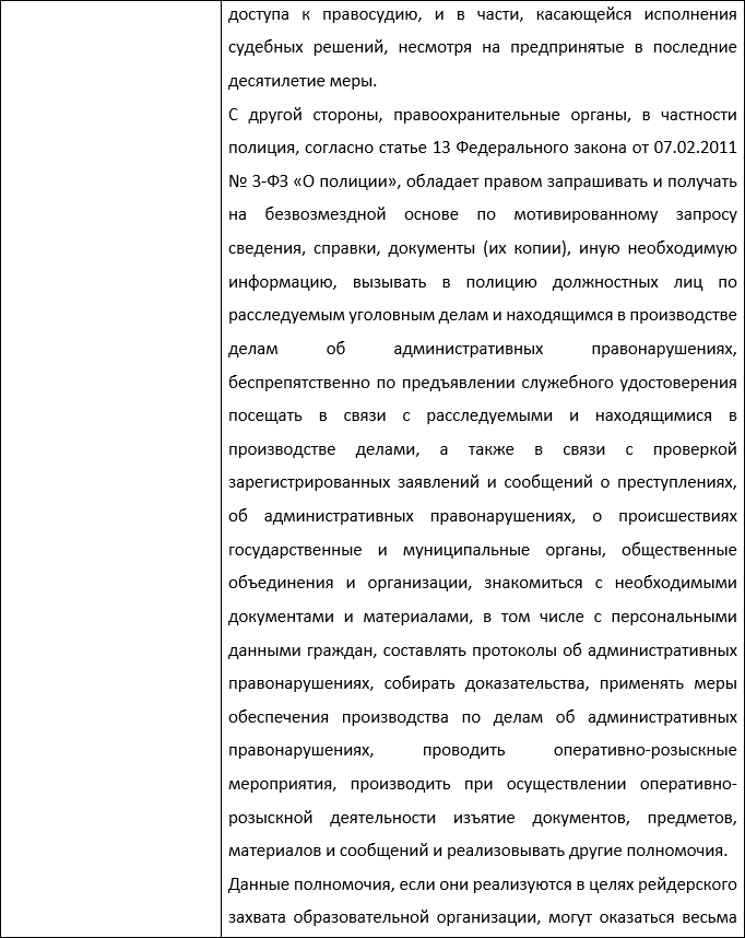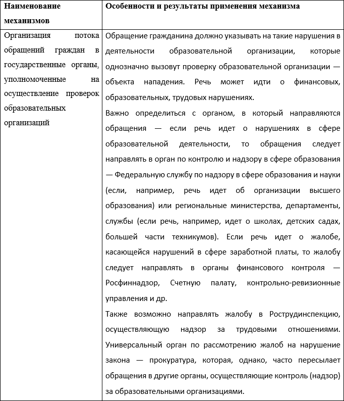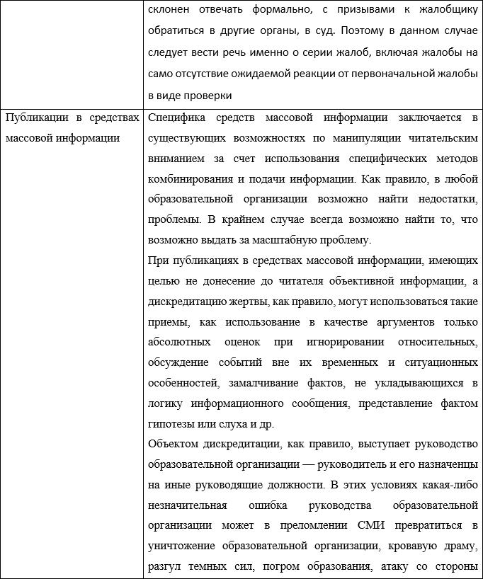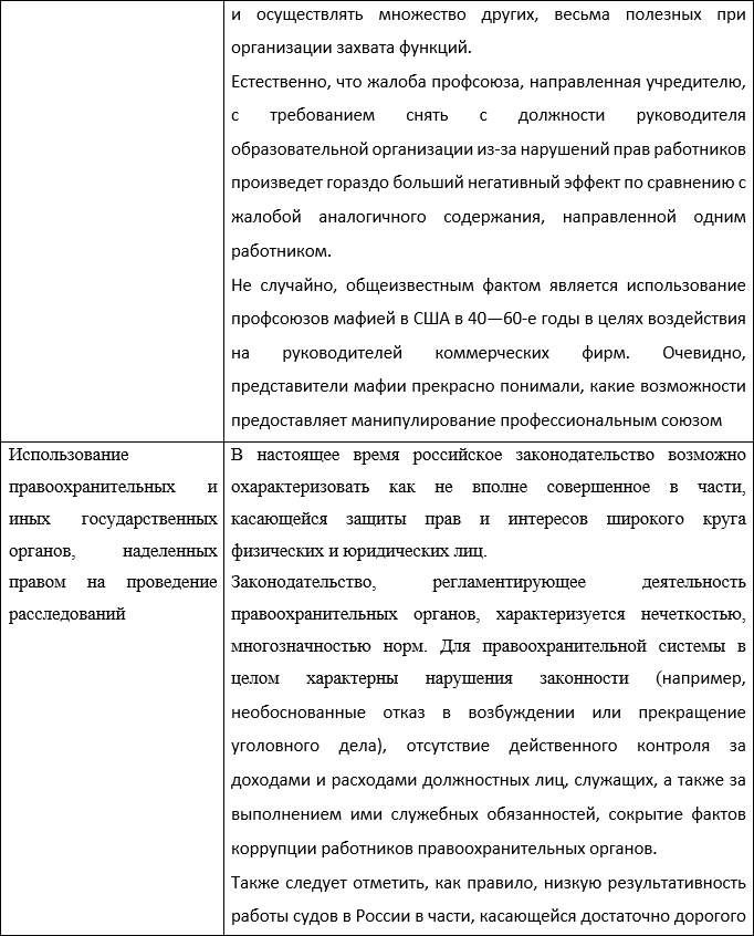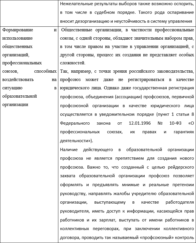 6. К числу механизмов, используемых при рейдерском захвате образовательной организации, возможно отнести организацию потока жалоб в государственные органы, уполномоченные на осуществление проверок, использование публикаций в средствах массовой информации, использование выборов, формирование и использование общественных организаций, профессиональных союзов, способных воздействовать на ситуацию в образовательной организации, использование правоохранительных и иных государственных органов, наделенных правом на проведение расследований, дискредитацию образовательной, научной и иной деятельности образовательной организации, внедрение в коллектив образовательной организации «своих» людей, подделку документов, использование криминальных методов давления и угроз в отношении руководителя и иных членов коллектива образовательной организации и другие способы.
