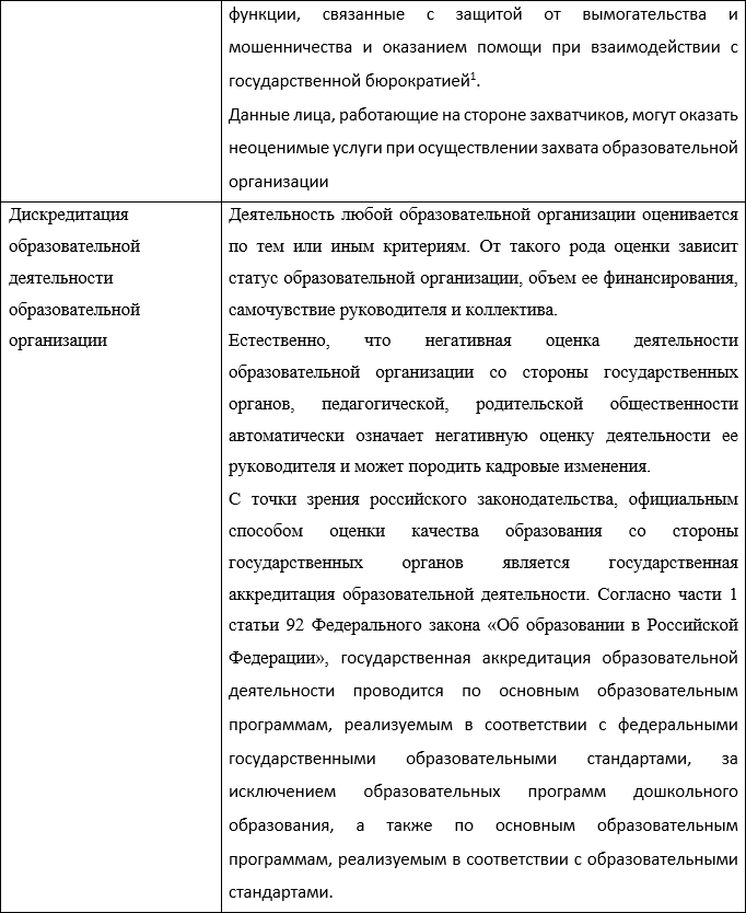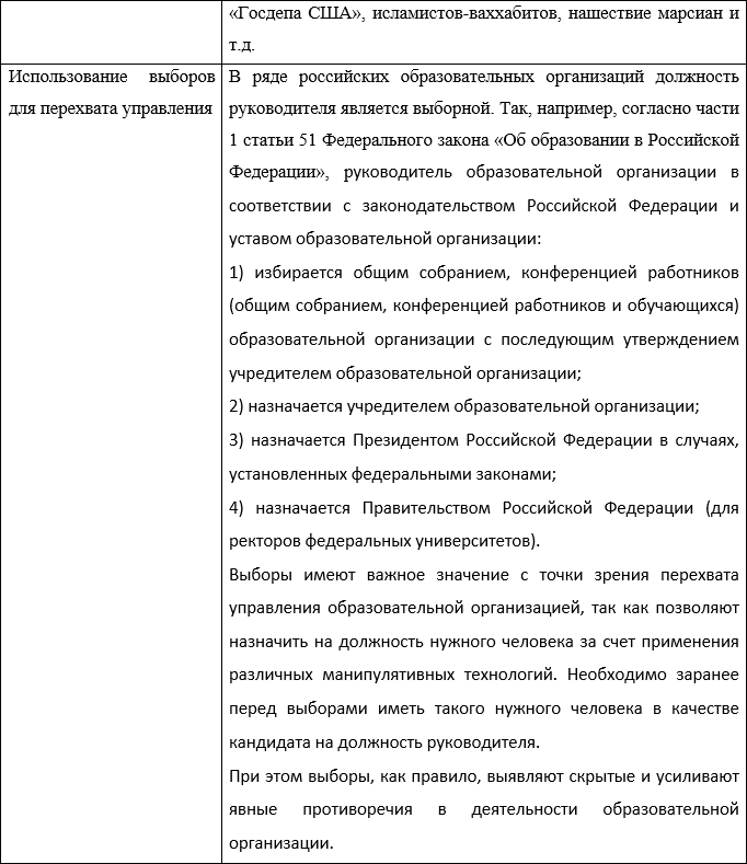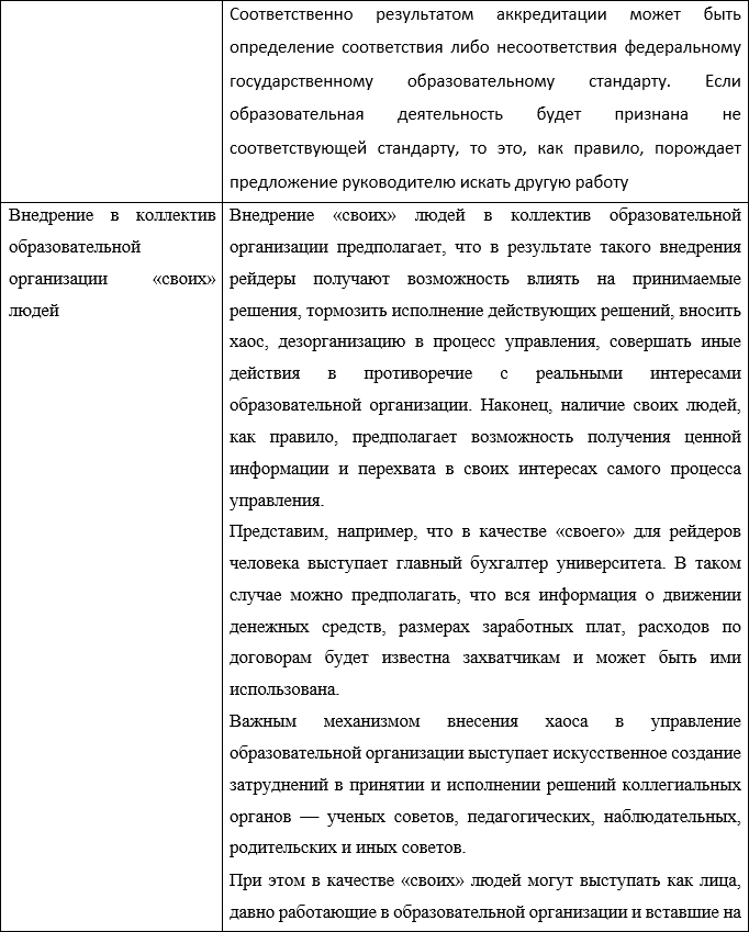 – ангажирование действующего руководителя образовательной организации, создание таких условий, при которых действующий руководитель образовательной организации будет осуществлять руководство в интересах захватчиков (захватчика).