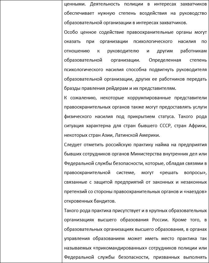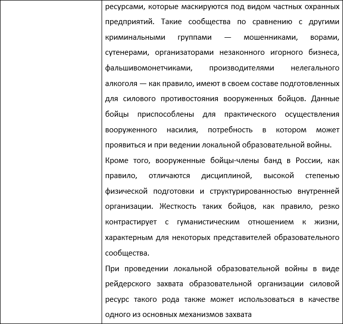 По сути, рейдерский захват представляет собой наиболее распространенный в России вариант локальной образовательной войны, при котором определенная группа лиц ведет войну против действующего руководства образовательной организации, используя как легальные, так и нелегальные механизмы.