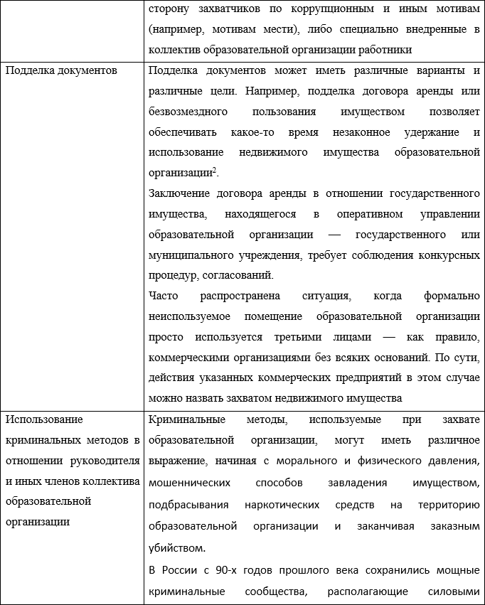 Тем не менее, по нашему мнению, рейдерский захват является возможным и по отношению к образовательным организациям в России. Однако такого рода рейдерский захват предполагает применение иных методов, в отличие от методов, часто применяемых при захвате акционерного общества или общества с ограниченной ответственностью.