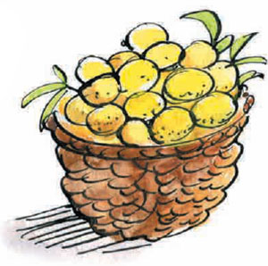 Она снова подхватила внучек, чихнула и очутилась на ветке дерева с большими жёлтыми лимонами.