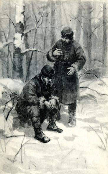Староста перебрался через засеку и позвал рыболова. Тот выскочил из-за дерева и спрятался. Боится. Доброга бросил рогатину и меч и пошел безоружный. Биар выбежал навстречу.