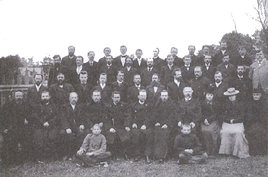 Сергей Иванович Чернышев среди служащих, учителей и врачей фабрики в Пирогово (сидит в центре, справа батюшка местного храма)