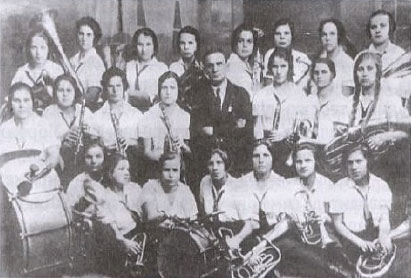 Духовой оркестр из рабочих фабрики «Пролетарская победа» (в центре, в папахе первый директор фабрики А. Преснов; слева К. Кацари – руководитель оркестра). 27 марта 1926 года в 3-летний юбилей оркестра