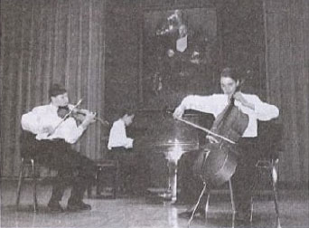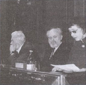 Слева направо: Федор Васильевич Поленов (внучатый племянник С. И. Мамонтова), Сергей Николаевич Чернышев (правнук С. И. Мамонтова), Н. Дуданова – искусствовед