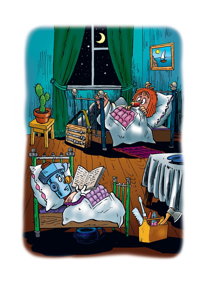 Самоделкин и Карандаш давно уже лежали в кроватях, и железный человечек читал Карандашу вслух страшную сказку: