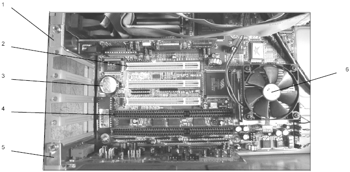 Рис. 1.18. Слоты расширения на системной плате: 1 – видеоадаптер, вставленный в слот AGP; 2 – слот PCI; 3 – батарейка CMOS-памяти; 4 – слот ISA; 5 – звуковая карта, вставленная в слот ISA; 6 – кулер процессора