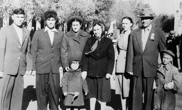 А. Хандохин, В. Хандохин, Т. Хандохина, М. Хандохина (бабушка), Л. Хандохина и Б. И. Качалин. начало 60-х.