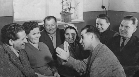 В рабочий полдень: главный рассказчик завода Якуб (дядя Яша) Аблямитов травит анекдоты С. И. Пикалькову, Адскову…
