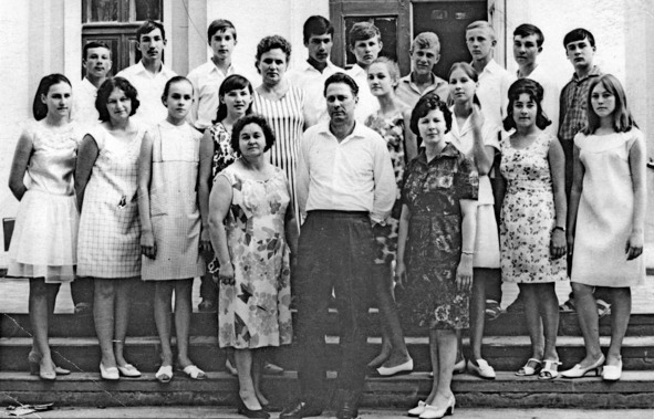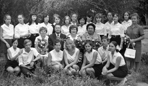 Выпуск 1971: П. Чаков, Н. Наконечный, Н. Ладурко, Г. Рудаков, Е. Бородин, М. Ульчёнкова, С. Клинчев и др. с учителями А. Ф. Пищик, В. Х. Клинчевым, Е. К. Коноваловой