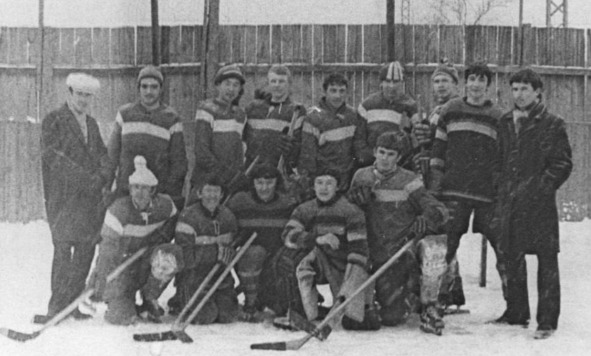 Хоккеисты шк. им. Гоголя в «коробке» ст. «Нефтяник»: А. Сегида, М. Ибраев, В. Перкин, У. Имангалиев, Л. Бородкин, Н. Бочков и др. 60-е.