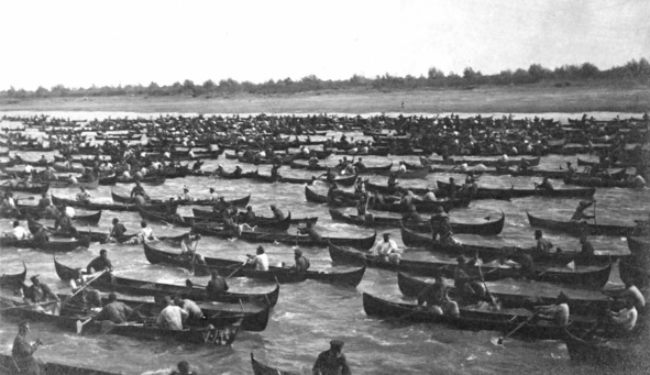 На весеннем севрюжьем рыболовстве участвуют все желающие уральские казаки, плывут они в бударках (т. е. легких длинных лодках) до устьев Урала и до берегов моря, в каждой бударке находятся 2 или 3 казака. Во время этого рыболовства, охватывающего значительную часть Урала, рыболовствующее войско, или так называемая громада, должны двигаться все вместе и правильно. Для этого назначаются границы, называемые рубежами, означающие место, до которого можно плавать и за которое можно переходить не иначе, как уже на другой день. На другой день начинается лов с этого рубежа и идет до следующего; таким образом от рубежа к рубежу проходят весь Урал. Всех рубежей от Уральска до берегов моря считается 20. Лов начинается не ранее солнечного восхода или, по крайней мере, совершенного рассвета. У рубежа, при котором дневной лов должен окончиться прежде, нежели плавающее войско успеет его достигнуть, ставится кибитка начальника. По окончании ежедневного лова до заката солнца все лодки вытаскиваются на берег, дабы никто тайно не ловил ночью.