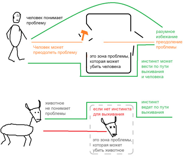 Рассмотрим эту разницу на еще одном примере. До появления самолетов люди сами по себе не летали, и поэтому отобранных эволюцией инстинктов, поведенческих программ для безопасного полета у нас нет. Но опытные пилоты учатся распознавать опасные ситуации благодаря ощущениям от полученного опыта, и по показаниям приборов. Приборы в самолете сложнее тем, что «добро и зло» проявляют себя не однозначно, как на термометре при печении пирога, а в сложном соотношении показателей разных приборов. Теперь представим, что в кабине самолета сидит неопытный пилот: он знает, как надо правильно лететь, но он еще не способен вовремя распознать, как самолет переходит к опасному режиму. Его ощущения еще не закрепились, а быстро понять сложные соотношения показаний приборов он не может. В этом случае, при появлении проблемы с самолетом, пилот остается спокоен: ведь он жив, его инстинкты молчат, и он не пытается «выживать», хотя самолет уже приближается к гибели. Не зная о том, каким образом к нему приближается смерть, пилот не пытается преодолеть проблему. «Выживание» в чистом виде не помогает. Но вот наступает момент, когда пилот понимает, что показания приборов выходят из допустимых параметров: он узнает о проблеме. Какие действия должен сделать пилот? Инстинктов полета у него нет, т.к. он не птица, и положиться на инстинкты он не может. Значит, перед тем, как произвести действия для спасения самолета, пилот должен знать, какую именно проблему нужно преодолеть. Он должен понять, в чем именно состоит проблема. Самолет слишком опустил нос или слишком задрал нос при заданной скорости и текущей высоте. Скорость слишком большая или слишком маленькая для известного веса и размера самолета. Высота слишком большая или слишком маленькая при имеющемся рельефе местности. И так далее. Но только после понимания можно будет преодолеть проблему: только после того, как летчик узнает, в чем именно состоит проблема полета. Так мы видим, в чем разница между «выжить» и «преодолеть проблему». Конечно, в обычной жизни мы можем употребить оба этих понятия в одной и той же ситуации, но по сути «выживание» – это скорее животное состояние, связанное с инстинктивной и рефлексивной активностью по избеганию проблем «здесь и сейчас» и всегда в настоящем моменте. В то время как «преодоление проблемы» чисто человеческое состояние, связанное с пониманием происходящего в динамике системы времен: будущего, прошлого и настоящего.