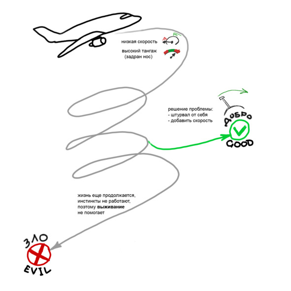 Рис. 4. Если неопытный пилот не знает о штопоре, то само по себе желание «выжить» никак не поможет ему, т.к. пока самолет не упадет, жизни пилота ничто не мешает. Но только пилот, знающий о быстро приближающейся из-за штопора смерти, может предпринять действия, чтобы избежать будущей, существующей только в абстрактной модели, и еще не существующей для него в реальности, гибели. Так одно только «знание о смерти» оказывается эффективнее «выживания».