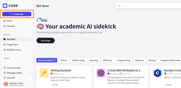 Переходим к инструменту под названием COZE, самому необычному на сегодняшний день. Здесь потребуется зарегистрироваться. Бесплатно. Например, с учетной записью Google. Нажимаем кнопку Get started справа сверху – то есть начать работу. Здесь мы сможем создать своего собственного бота, с которым будем дальше общаться.