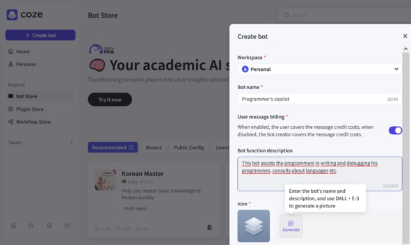 Далее в диалоговом окне Create bot – Workspace – Personal. Мы придумываем ему свое собственное название Bot name. Описываем его работу Bot function description. Генерируем ему иконку – картиночку. Нажимаем кнопку Confirm – подтвердить.