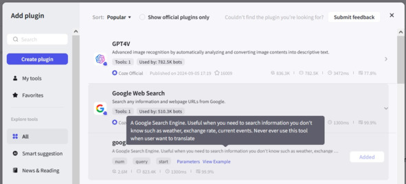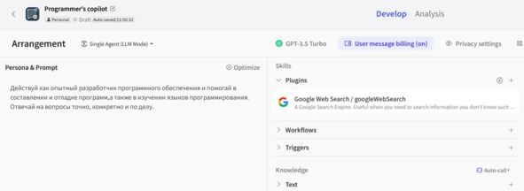 Далее, в разделе Skills – возможности – подключаем plugins – плагины – дополнения. Например, Google Web Search – поиск с помощью Google. Теперь у нашего бота есть выход в интернет для поиска свежей информации.