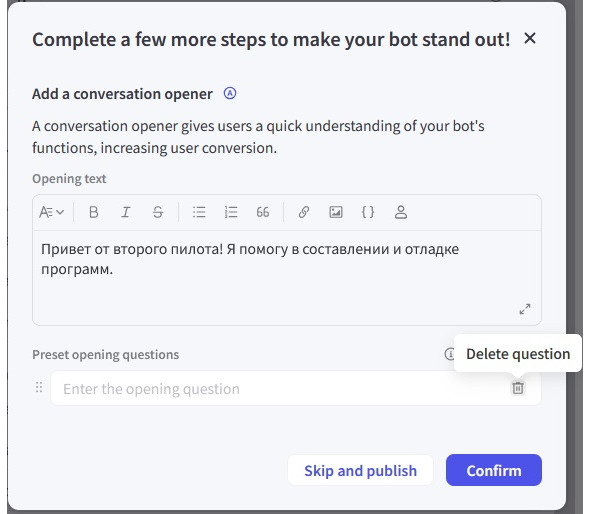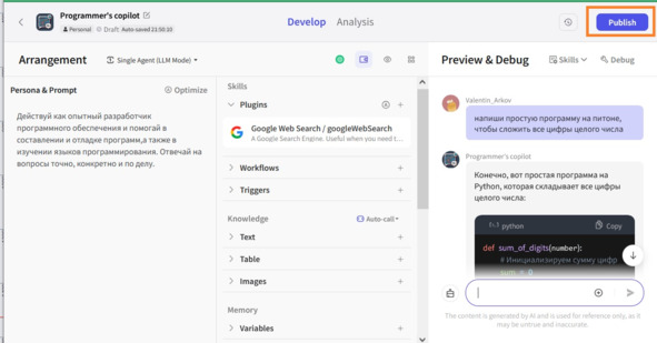 Дальше на сервисе COZE мы можем сделать бота, с которым будем общаться через Телеграм. Для этого переходим к публикации. Справа сверху нажимаем кнопку Publish. В диалоговом окне настроим Conversation opener – начало диалога и рекомендуемые вопросы (их можно удалить). Нажимаем Confirm – подтвердить.