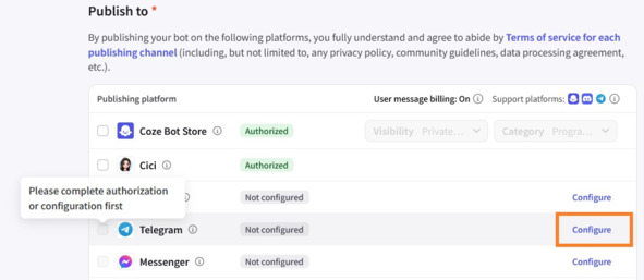 В диалоге Publish to указываем платформу для публикации бота снимаем галочку Coze Bot Store – официальный магазин ботов. Видим, что в разделе Telegram у нас галочка не активна. Зато справа есть кнопочка Configure – настроить.