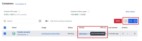 Запуск происходит очень быстро. Практически мгновенно. Теперь в колонке Порты – Ports становится активной ссылка на номер порта. Наводим на неё курсор и видим всплывающую подсказку – адрес сервиса – localhost. Щёлкаем по ссылке и в браузере открывается Jupyter Lab.