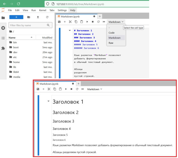 Здесь мы вручную можем изменять тип содержимого ячейки – кодовая (Code) или текстовая (Markdown).
