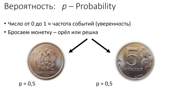 Вероятность обозначается латинской буквой p. Это первая буква английского слова probability. Происходит от латинского слова proba – «пробовать, проверять». Получается, что один раз попробовал что-то сделать – получилось, в другой раз попробовал – не получилось. Когда мы что-то пробуем, появляется случайность, неопределённость, непредсказуемость. И вероятность – это частота события, насколько часто происходит то, что нас интересует.