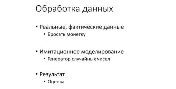 Когда мы говорим о реальных данных, опыт с монеткой можно провести «физически» – действительно бросать монетку много раз. Есть и другой вариант – использовать программный генератор случайных чисел. В этом случае мы имеем дело с тем, что называется ИМИТАЦИОННОЕ МОДЕЛИРОВАНИЕ. Это целая технология, но мы с вами затронем эту область только для того, чтобы увидеть, как это происходит. Мы будем моделировать идеальные, красивые данные, на которых можно тренироваться. Потом, на лабораторных работах можно будет взять реальные, настоящие данные. Они уже не такие «красивые». Они могут быть «корявыми», «неправильными», какими угодно. Но они чем-то будут напоминать нашу теорию и наши результаты.