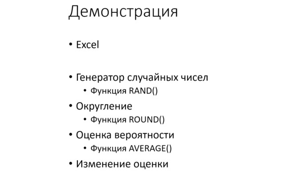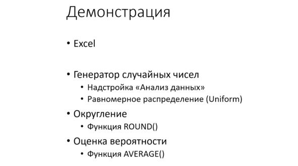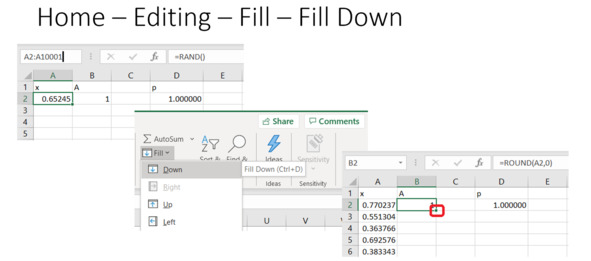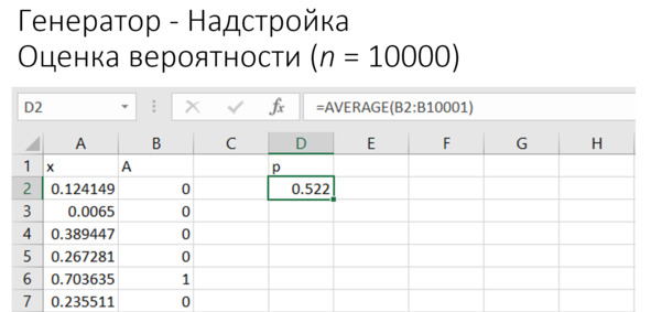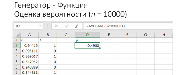 Есть и другой способ генерирования случайных чисел. Это готовая функция RAND / СЛЧИС. Мы его тоже можем разобрать. Внешне всё будет выглядеть точно так же, как в предыдущем примере: столбец «иксов» и столбец нулей и единиц, затем оценка частоты, то есть вероятность, см. рис.