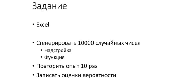 Вам предстоит сгенерировать 10000 случайных чисел и повторить этот опыт 10 раз. Затем записать ваши оценки вероятности. Можете записать от руки в конспект или приложить копию экрана, чтобы показать, что вы это проделали.