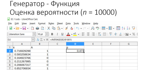 Подведём итоги. Мы вызвали генератор случайных чисел с помощью надстройки, установили равномерное распределение, округлили и нашли оценку вероятности – как среднее из нулей и единиц. Что это значит применительно к нашей формуле? В числителе находится количество единиц – это число событий, которые нас интересуют. В данном случае сумма единиц – это количество событий, когда выпал орёл. В знаменателе – общее количество событий. В нашем примере это 10000. Так что если у нас нули и единицы и мы считаем среднее из этого количества данных, мы автоматом получаем оценку нашей вероятности. Она называется ЧАСТОТА.