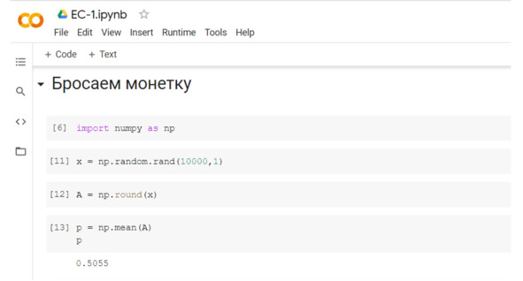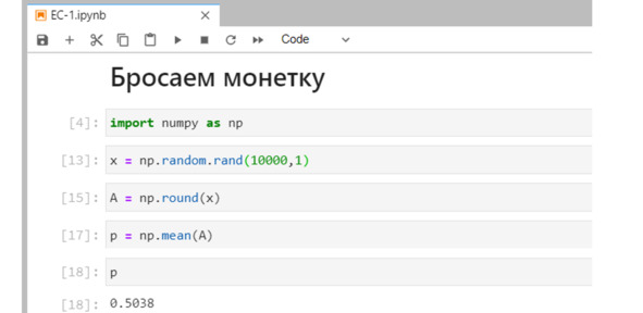 Вот наш результат – мы получили число, которое очень близко к 0,5. Но это не ровно 0,5. Просто достаточно близко к теоретическому значению.