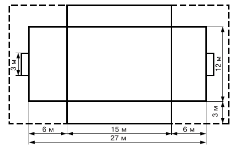 Игра в пляжный гандбол проходит на площадке длиной 27 м и шириной 12 м, засыпанной слоем песка в 40 см (рис. 2). В 6 м от лицевых линий эластичными цветными лентами шириной 8 см или веревками отмечаются зоны ворот, а между ними образуется игровая зона (15 × 12 м).