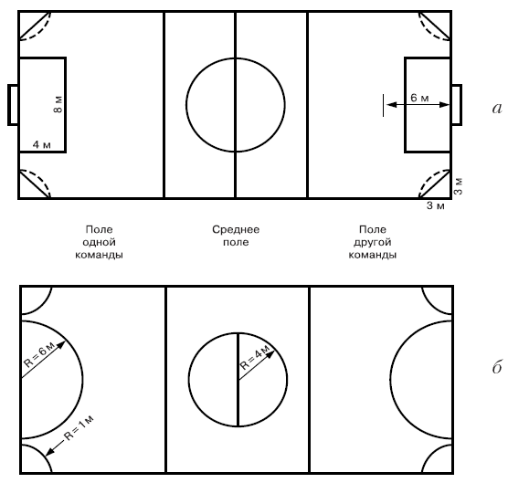 Рис. 3. Разметка площадки для игры в гандбол 7 × 7 в разные периоды: а – по правилам 1923 г., б – по правилам 1948 г.