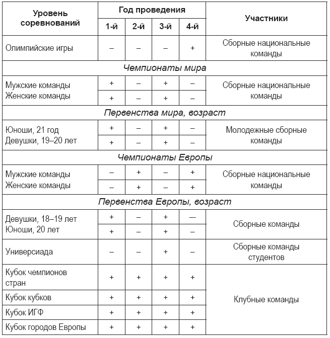 Система международных и российских соревнований в четырехлетнем цикле представлена в табл. 2 и 3, однако современные гандболисты участвуют и в так называемых коммерческих соревнованиях. Эти турниры или отдельные матчи позволяют улучшить материальную базу игроков и команды в целом.