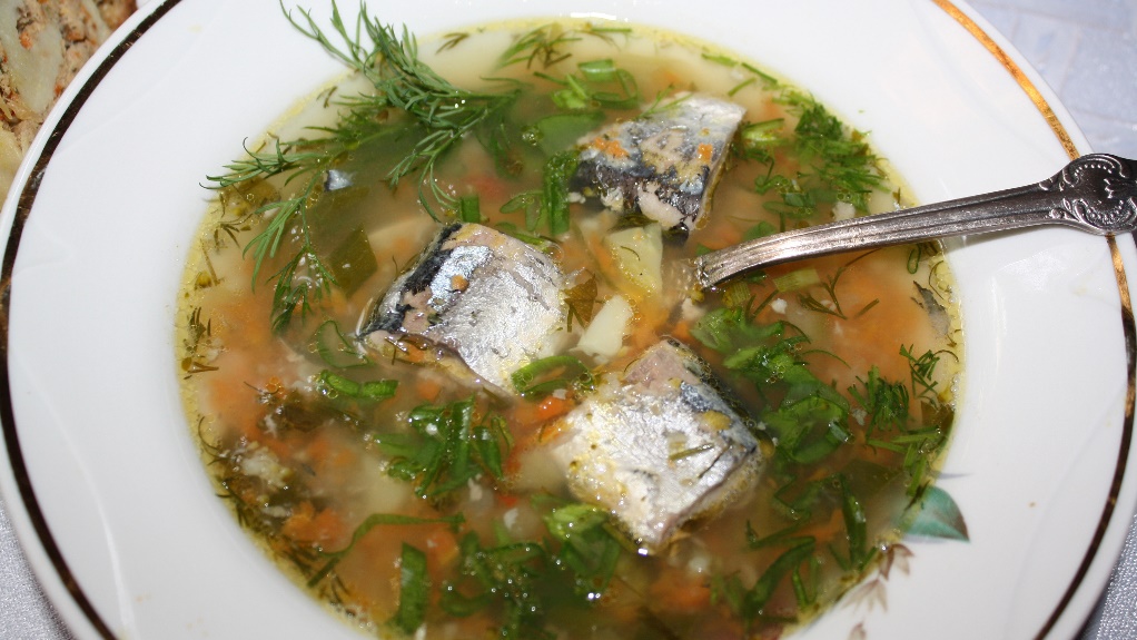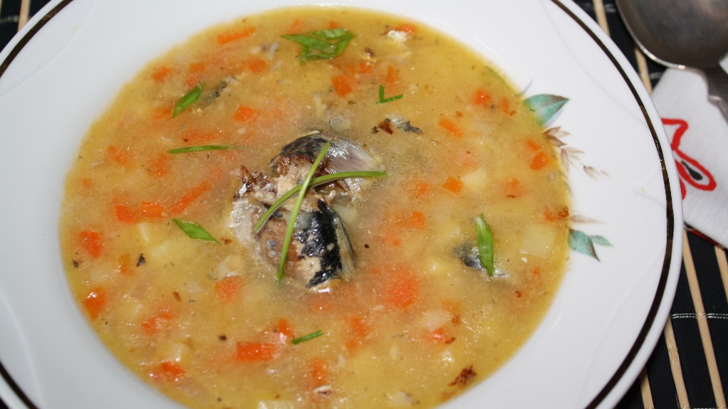 150 гр картофеля, по 50 гр моркови и репчатого лука, 250 мл воды, 50 гр консервированной сардины, 1 столовая ложка заправки из консервной банки, соль, пряности по вкусу, 2-3 пера зеленого лука.