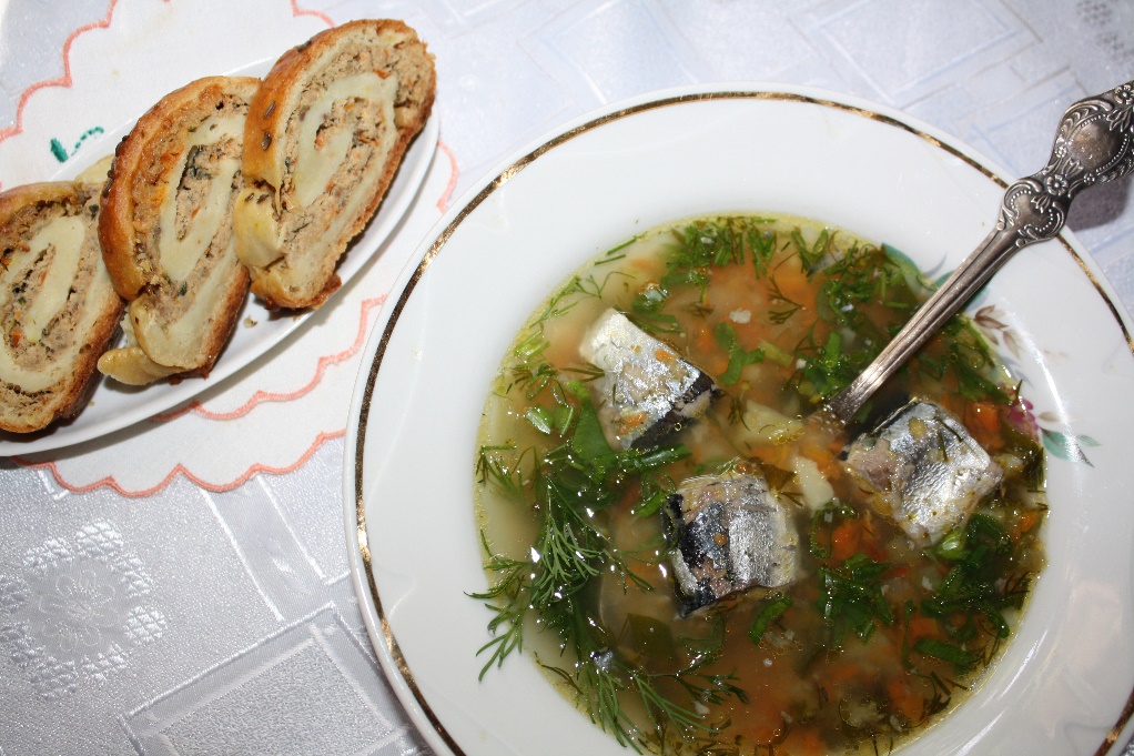 Суп разлить в тарелки, гарнировать картофельным рулетом или пирожками.