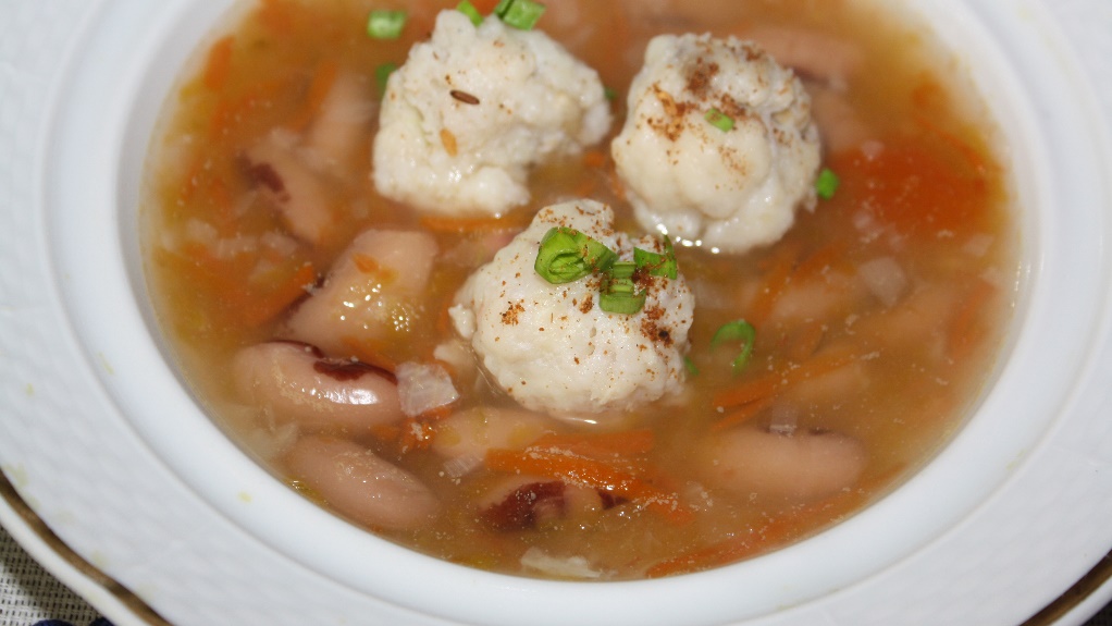 По 100 гр тыквы и моркови, 30 гр репчатого лука, 20 гр красного помидора, 2 столовые ложки отварной фасоли, пряности по вкусу, несколько молодых листьев чеснока. 0,5 литра воды.