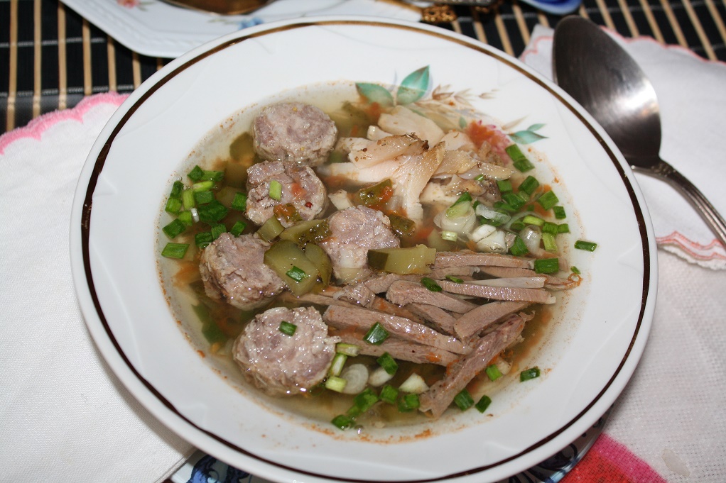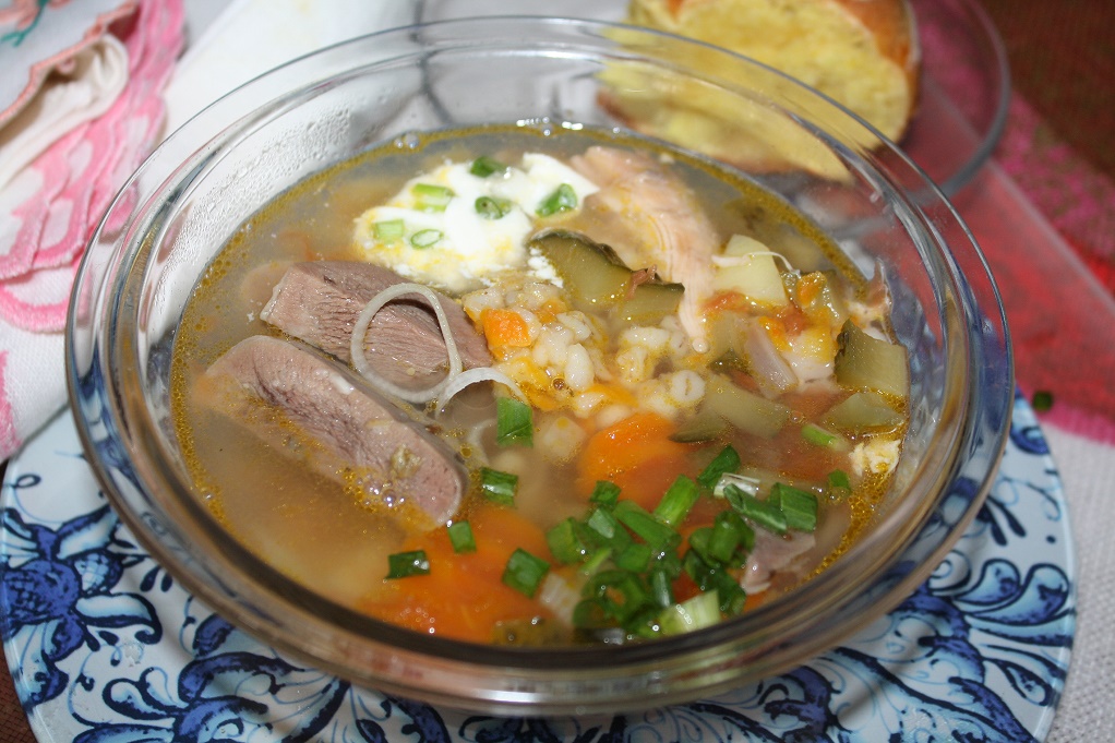 По 100 гр картофеля и маринованных огурцов, по 50 гр моркови, помидоров и репчатого лука, 3 столовые ложки отварной перловой крупы, по 100 гр отварного мяса и телячьего языка, 0,8 л бульона (овощной, куриный или мясной), 2 столовые ложки сметаны, стебель зеленого лука, соль, пряности по вкусу, при необходимости 100-150 мл огуречного рассола (в этом случае количество бульона необходимо уменьшить).